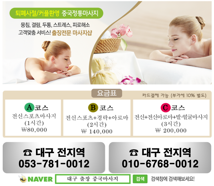 대구 전지역 출장가능 뭉침, 결림, 두통, 스트레스, 피로해소 등 고객맞춤 서비스! 출장전문 마사지샵 숙련된 관리사가 24시간 연중무휴로 대기중